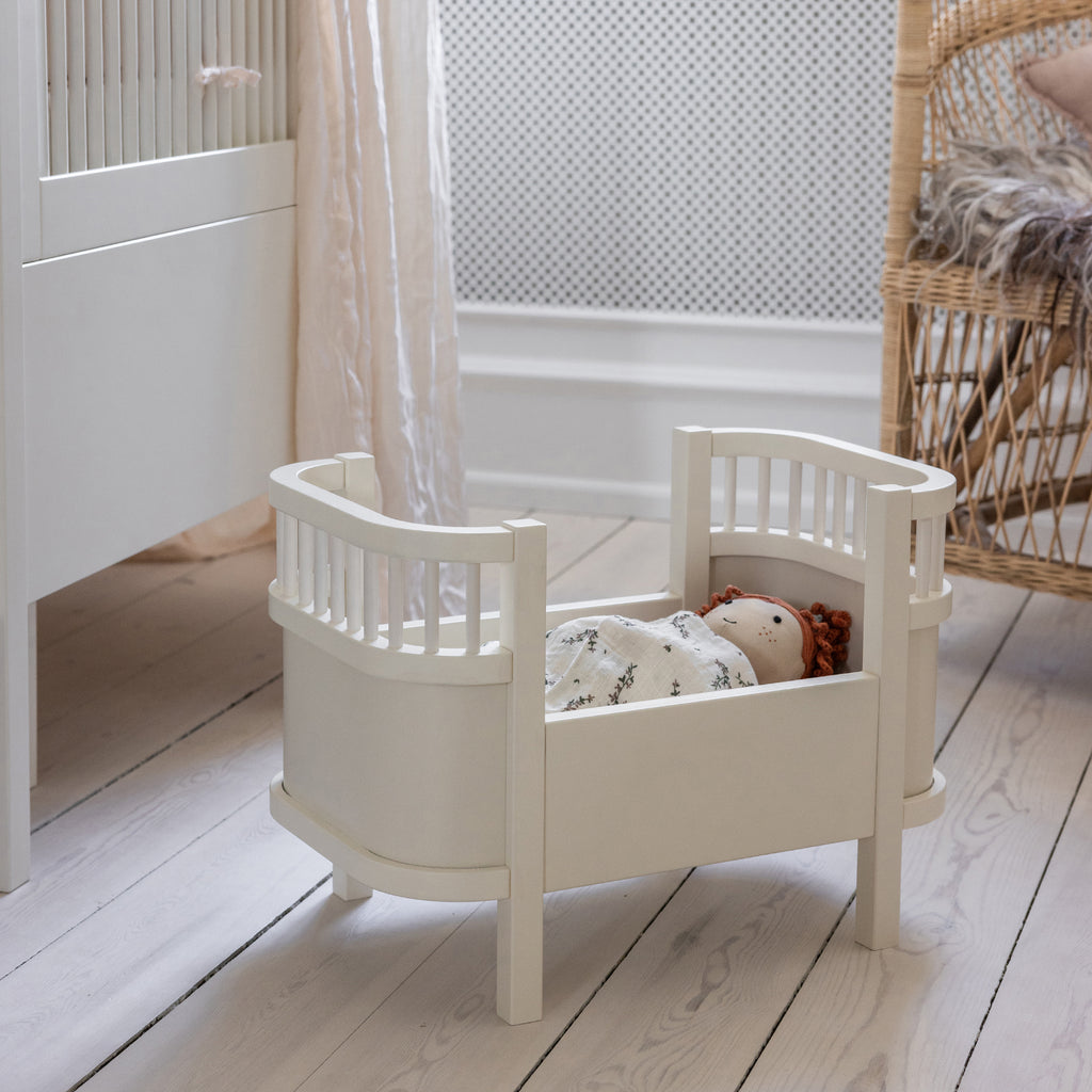 Den er designet med runde hjørner og tremmer, så dukker og bamser kan puttes i en seng, der ligner barnets egen – en fin detalje, der skaber genkendelse og glæde hos de mindste. Sengen er solidt bygget i certificeret træ og egnet til børn fra 1 år og opefter.