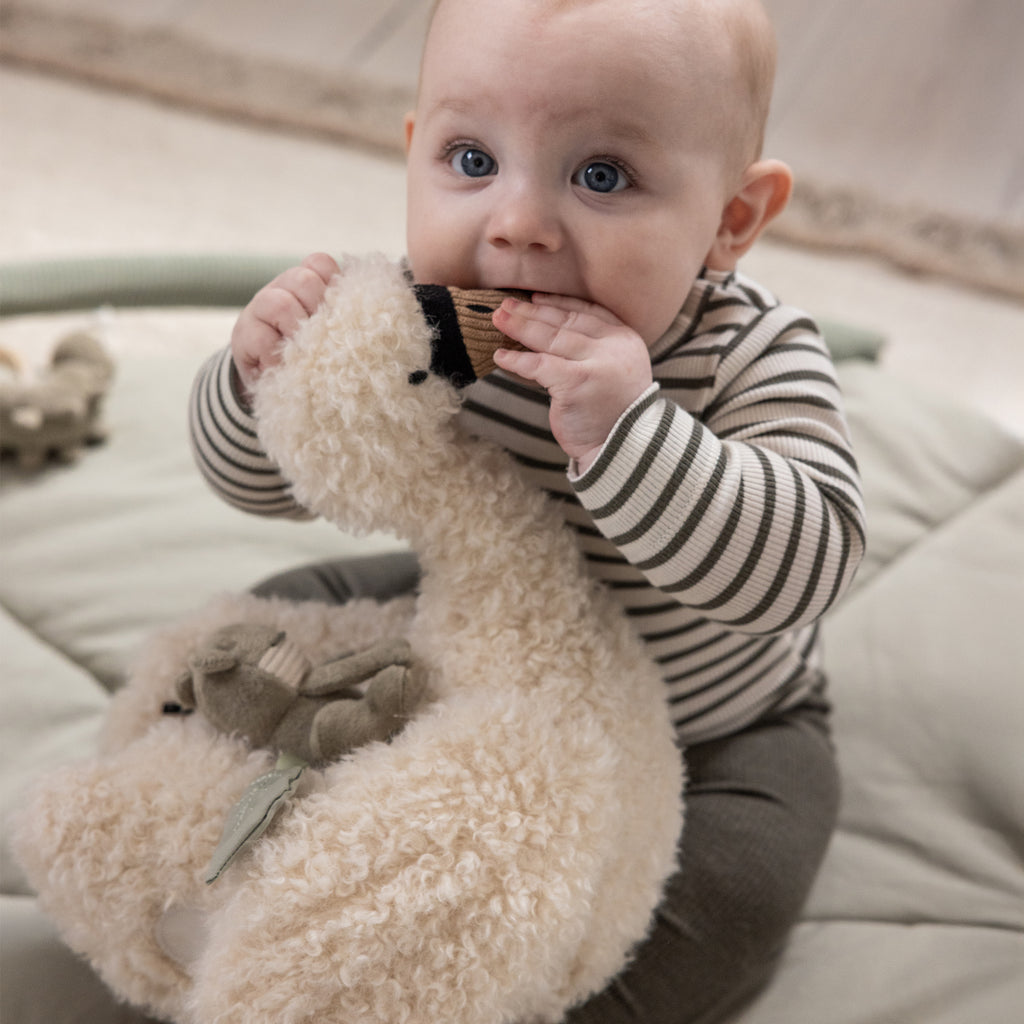 Ultrablød aktivitetslegetøj designet som en svane – fyldt med små, sjove overraskelser, der stimulerer barnets fantasi og sanser.