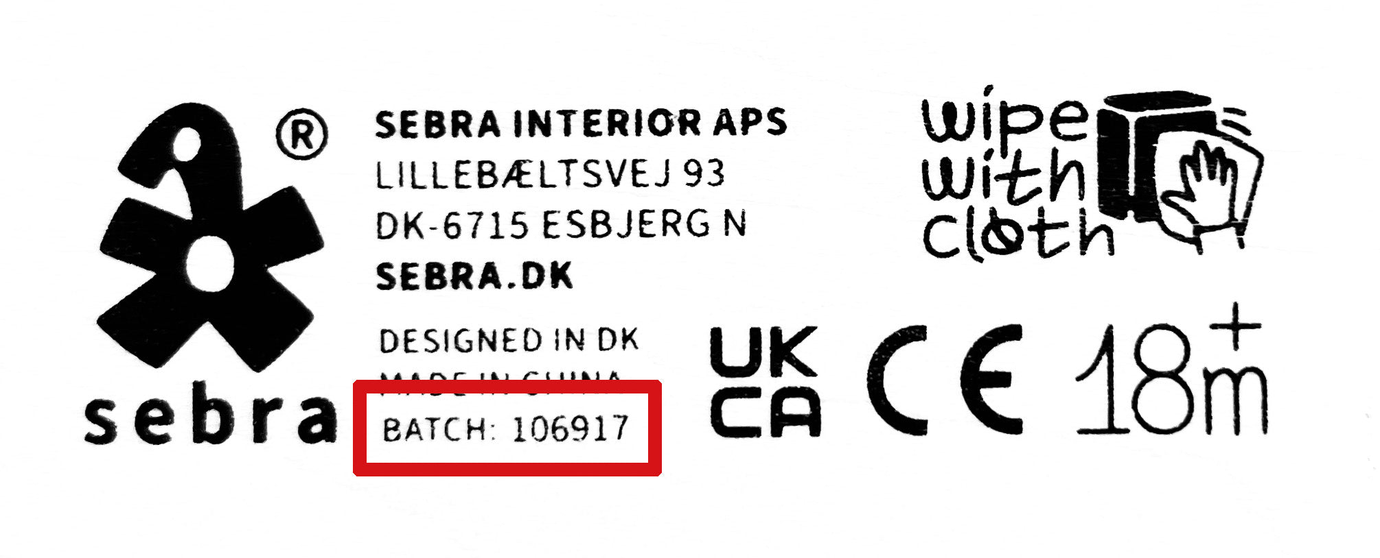 Har du købt produktet, skal du omgående fjerne det fra dit barn og kontakte den forhandler, du har købt produktet hos. Sebra har kontaktet de forhandlere, som har solgt produktet, og salget af batchnummer 106917 er stoppet.